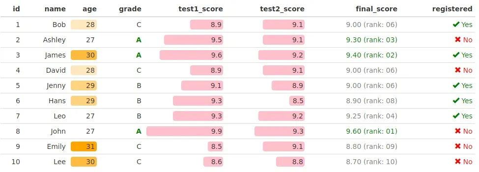 - 包含流程图中的指标的打分信息,并且以柱形图或颜色的形式展示在表格中;