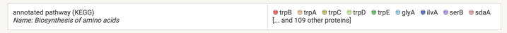 The analysis section give some brief statistics of the inferred network, such as the number of nodes and edges. The average node degree is a number of how many interactions (at the score threshold) that a protein have on the average in the network. The clustering coefficient is a measure of how connected the nodes in the network are.