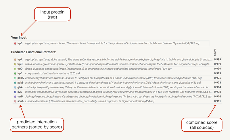 In the Legend section a list your input(s) is shown. Predicted associations are shown immediately in a list below your input, sorted by score. If input gene is a fusion of two functions, both will be shown. Clicking on the score bullets gives you a breakdown of the individual prediction method scores. Clicking on a gene name gives you the protein sequence as well as a list of similar proteins in STRING. Initially, only predictions with medium (or better) confidence, limited to the top 10 interactors will be shown. These parameters can be changed in the data settings.